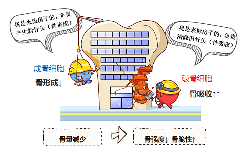 骨质疏松是一种全身性骨骼疾病,一般从30岁开始,身体的各个器官开始出现一系列退化,骨骼也不例外。骨骼中有两种细胞——破骨细胞和成骨细胞,它们不断重复着时空偶联的骨吸收和骨形成过程,维持骨骼完整性。骨质疏松会不会发生,主要取决于成年期前获得的峰值骨量的高低和成年后的骨量丢失速度。
