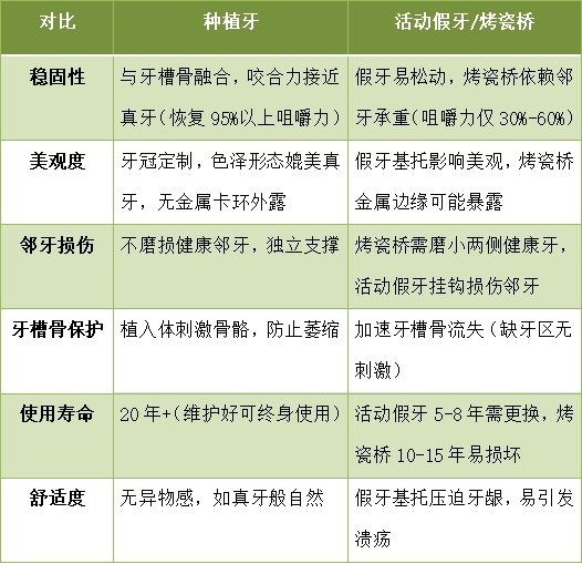 二、种植牙与传统修复方式(活动假牙/烤瓷桥)的对比