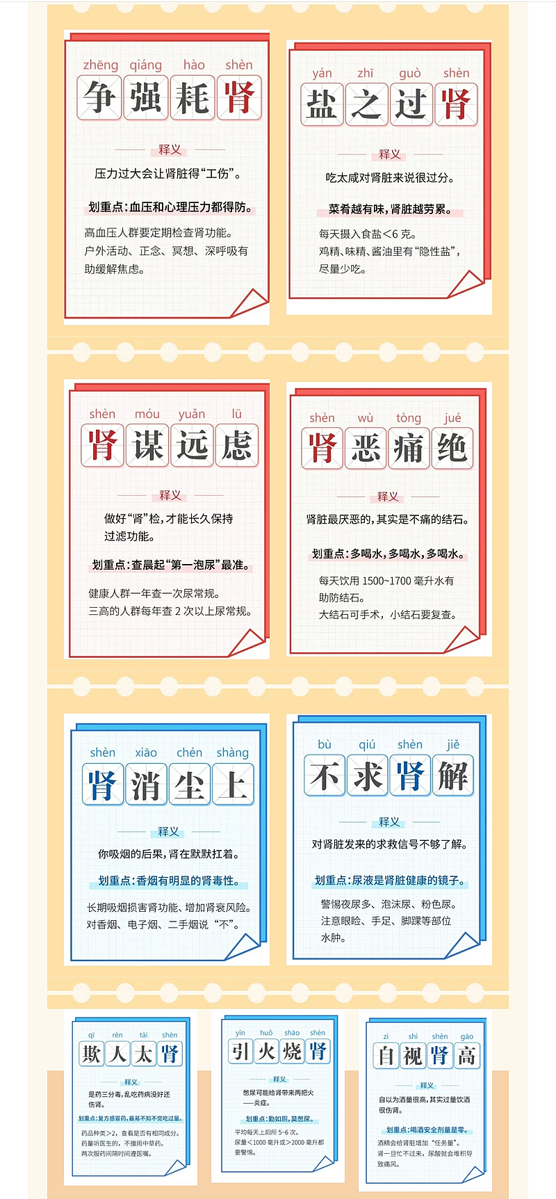 每个肾脏中,约有80万至100万个肾单位(由肾小球、肾小囊和肾小管组成)在日夜运转。这些肾单位“工作勤勉”却“性格隐忍”——即便部分肾单位因长期超负荷运作而受损、死亡,剩余的肾单位也会立刻“补位”,继续维持肾脏功能。但必须警惕的是,肾单位属于不可再生资源,一旦过度损耗、“累倒” 过多,肾脏功能将逐渐衰退,严重时甚至引发不可逆的健康危机,后果不堪设想。下面为您带来一组成语新解,从熟悉的词汇中读懂肾脏的“秘密”,守护肾脏健康。