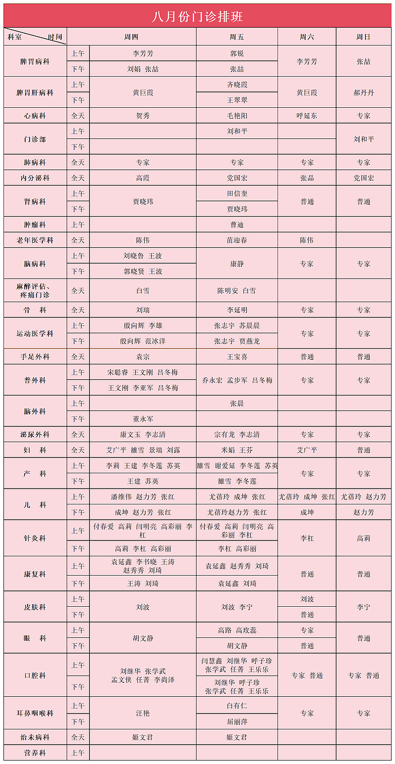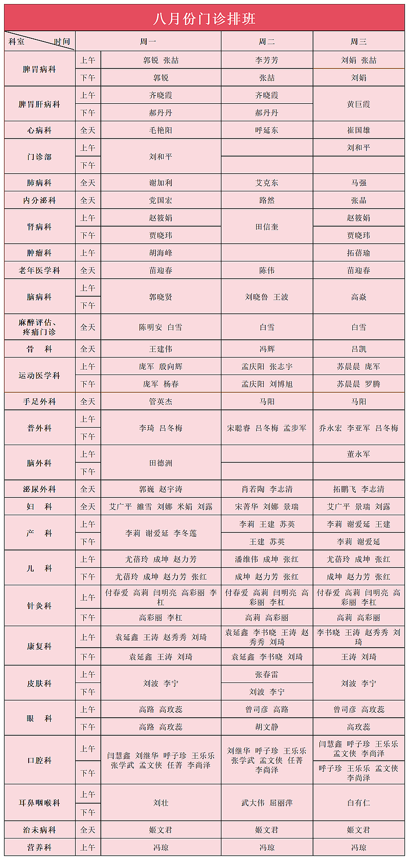 为了方便群众就医,延安市中医医院(北京大学第三医院延安分院)8月门诊排班表来啦!我院实行无假日门诊,患者可正常办理出入院手续,为您的健康保驾护航。