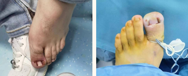 近日,22岁的小张由于化脓性甲沟炎住进了延安市中医医院(北京大学第三医院延安分院)手足外科,医生通过询问病史得知小张剪指甲时习惯剪的很深,近两年走路时脚趾总觉得隐隐作痛,于是小张就去了路边的修脚店寻求帮助,谁知不仅没有解决问题,反而使脚趾感染,开始红肿,还伴有渗出物,疼痛更加剧烈了,小张形容自己就像那“小美人鱼”,每走一步都像走在刀尖上,已经严重影响了他的正常生活,这才来医院就诊。医生对小张伤口分泌物做了细菌培养,结果显示小张左足多重耐药菌感染。医生为小张做了左足趾肉芽切除指甲重建术,并每天使用抗菌药膏涂抹创面,目前小张已顺利出院。