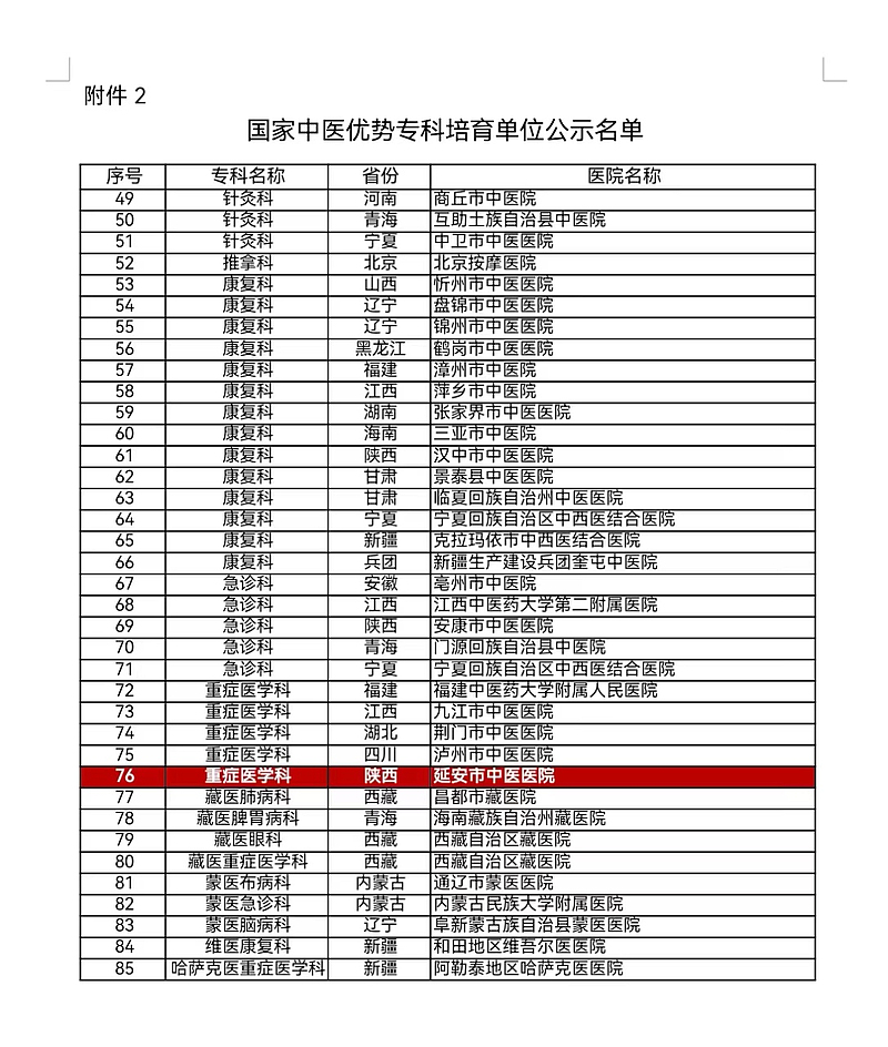 近日,《国家中医药管理局综合司关于国家中医优势专科建设拟入选项目名单的公示》发布,延安市中医医院(北京大学第三医院延安分院)重症医学科入选国家中医优势专科培育单位。