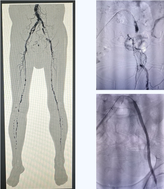 脑外科收治患者并完善相关检查发现:踝肱指数0.5,左下肢皮温低于右下肢,左侧足背、胫后、腘动脉搏动不明显。脑外科田德洲主任立即邀请北京大学第三医院韩金涛教授、刘启佳教授进行远程会诊,专家团队仔细研究患者病情,双下肢动脉闭塞,左下肢症状明显,经与患者及家属沟通征得同意,决定在局部麻醉下施行双下肢动脉造影+左髂动脉闭塞开通、球囊扩张成形术+支架置入术。