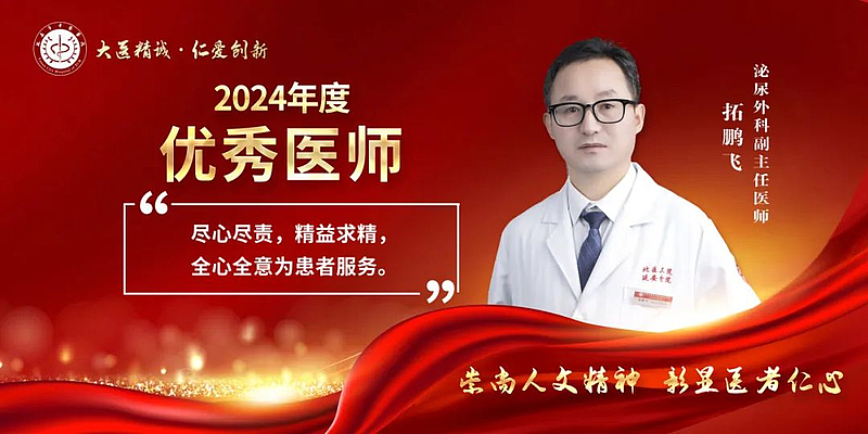 一名中年男性尿路上皮癌患者就是受益者之一。6个月前,因间断左侧腰腹部疼痛,伴肉眼血尿、高热,多次在外院就诊,诊断考虑为急性肾盂肾炎,给予对症抗感染治疗后仍无好转。患者带着焦虑的心情,在朋友介绍下找到拓医生寻求帮助。经过详细追问病史、仔细查阅外院检验结果及CT检查,发现患者除了复杂性尿路感染可能患有泌尿系肿瘤,为其实施了经皮肾穿刺活检术,病理检查明确诊断为:高级别浸润性尿路上皮癌。为患者制定了详细的手术治疗方案,并开展了进一步治疗,解决了患者的病痛,术后患者恢复良好,顺利出院。慢慢地,拓医生的口碑越来越好,慕名而来的患者逐渐增多。被患者认可,被患者需要是拓鹏飞最大的幸福,用心对待每一位患者是他永不变的医者初心。