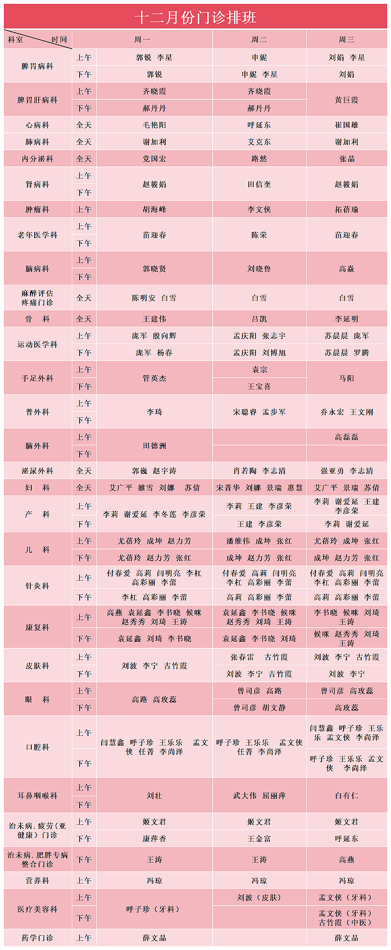 12月份门诊排班