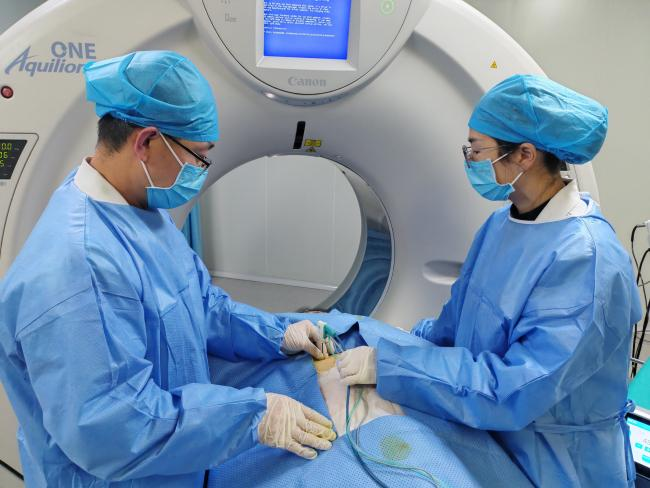 入院后,胸部增强CT检查显示:右肺中叶富血供病变,右肺中叶结节约2.6cmx2.2cm,考虑低度恶性肿瘤性病变。我院肺病科与影像科专家团队联合会诊,因患者在随访过程略增大,结合患者胸部增强CT不能排除低度恶性结节,现无法耐受手术,一直随访有发生突然增大及远处转移的可能,决定为患者实施CT引导下肺小结节穿刺活检同步微波消融术。“手术的难度较大,主要是结节位于中叶临近下叶斜裂处,跨叶间裂穿刺极易发生气胸和出血,一旦出血和发生气胸,都会掩盖肺小结节,导致穿刺失败,同时结节小且中叶呼吸动度大,结节距心脏近,穿刺有损伤心脏的风险。但为了患者的的健康,面对挑战,我们有信心搏一次。”肺病科主任谢加利介绍。