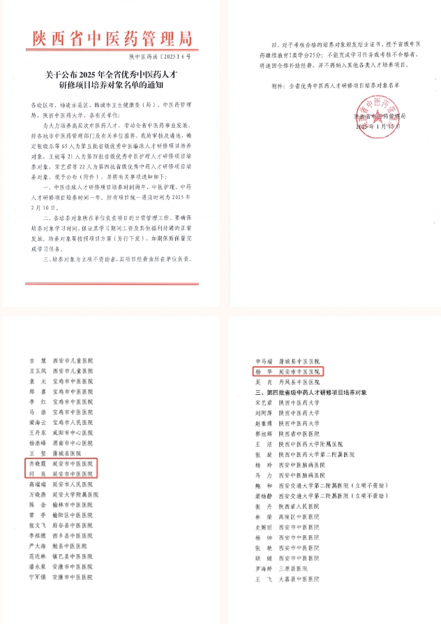 为大力培养高层次中医药人才,带动全省中医药事业发展,陕西省中医药管理局于近日公布了2025年全省优秀中医药人才研修项目培养对象名单,延安市中医医院(北京大学第三医院延安分院)感染性疾病科(脾胃肝病科)齐晓霞主任医师、老年医学科闫良副主任医师成为第五批省级优秀中医临床人才研修培养对象,急诊科护士长杨华成为第四批省级中医护理人才研修项目培养对象,标志着我院在中医人才培养与传承方面取得了新突破。