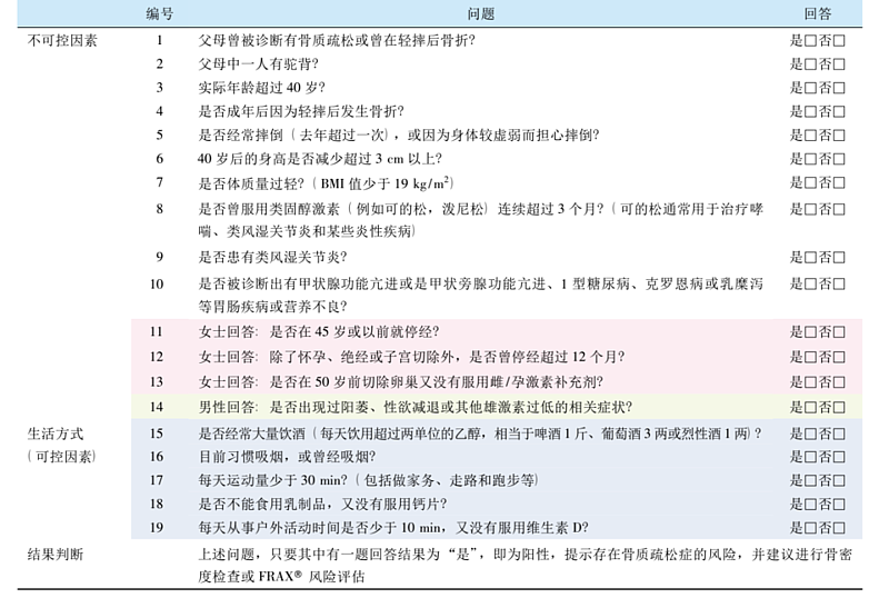 上面是国际骨质疏松基金会(IOF)骨质疏松风险一分钟测试题,可以用于自我骨质疏松风险评估。大家快来测一下吧!