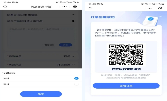 以往患者需要在医院等待取药,通常上午就诊下午才能拿到药,下午就诊则要等到第二天才能取到药,在医院等候煎药的时间对于患者来说非常漫长。为改善群众就医体验,延安市中医医院(北京大学第三医院延安分院)推出“药品邮寄到家便民服务”,来院就诊的患者在看诊结束后可以扫描“顺丰快递服务”小程序二维码进行操作,药品将由顺丰快递配送上门,不用在药房苦苦等候!
