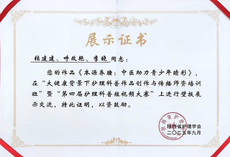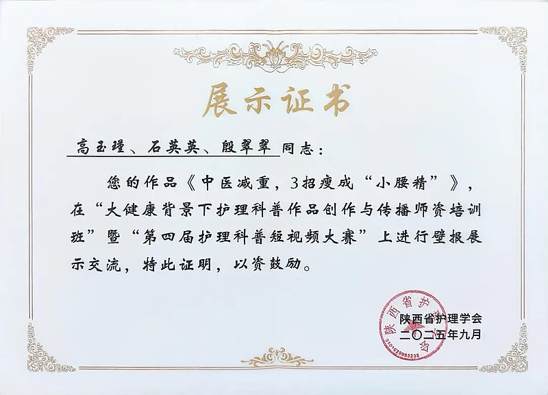 此外,我院护理人员呼改艳、高玉瑾通过系统培训与考核,成功获得“陕西省护理科普师资认证”,体现了我院在科普人才培养方面取得的扎实成效。