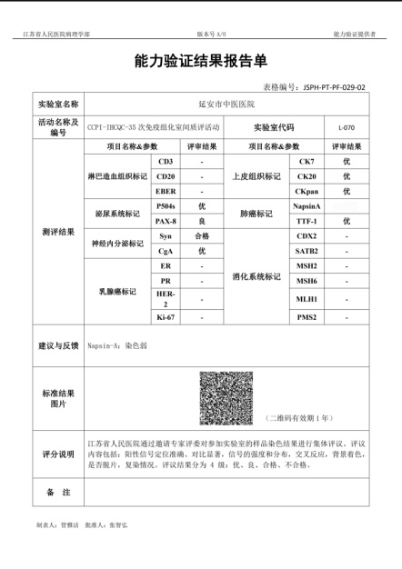在第三十五届全国免疫组化室间质评(CCPI-IHCQC-35)中,我院病理科团队认真完成各项检测工作,妥善处理泌尿系统、神经内分泌、上皮组织及肺癌组织等多类病理样本,顺利完成P504S、CgA、CK7、CK20、CKpan、TTF-1六项关键指标检测。经专家评审,所有参评项目均获得“优秀”等级,体现了科室对各类病理样本的检测与把控能力。